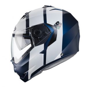 Öppningsbar hjälm i polykarbonat. Tillverkad i Italien till 100%. Käkpartiet kan låsas i det övre läget och hjälmen är därför godkänd både som integral och jet-hjälm. Integrerat solvisir med justerbart nedre läge.